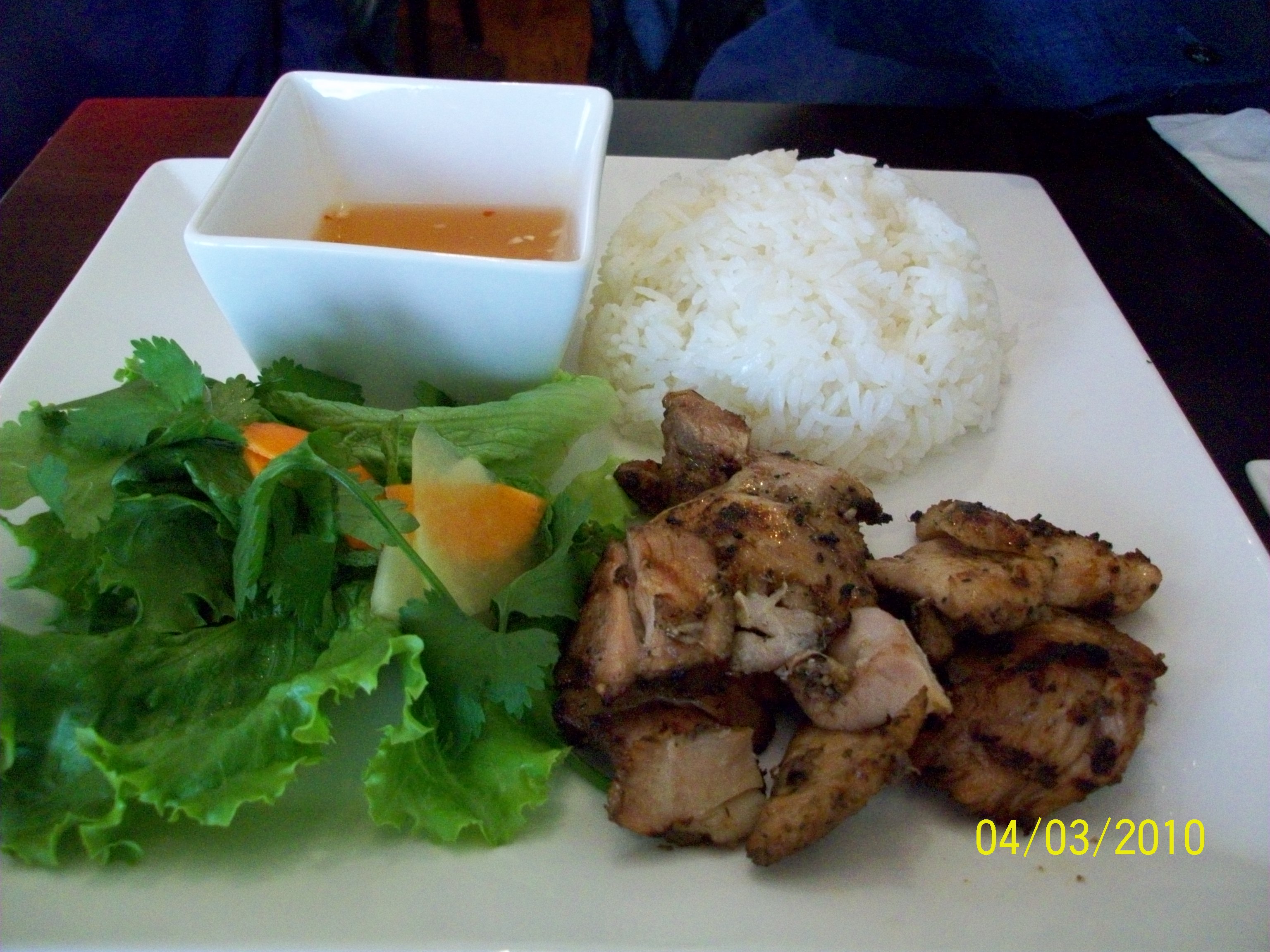 G ordered #9 com ga ngu vi (five spice grilled chicken over rice). And it was very yummy. The chicken was moist and flavorful. Not the best I have ever had, but not bad at all.