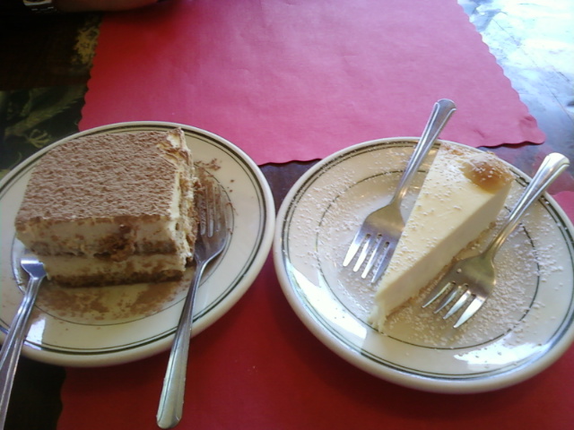 P and I ordered a coffee, tea, a slice of cheesecake, slice of tiramisu to eat there, and later I got a pannacotta to go for someone else. Umm. Amazon princess told me that pannacotta usually cannot be packed to go, but she figured a way to do it just for me, so thank you so much!!!