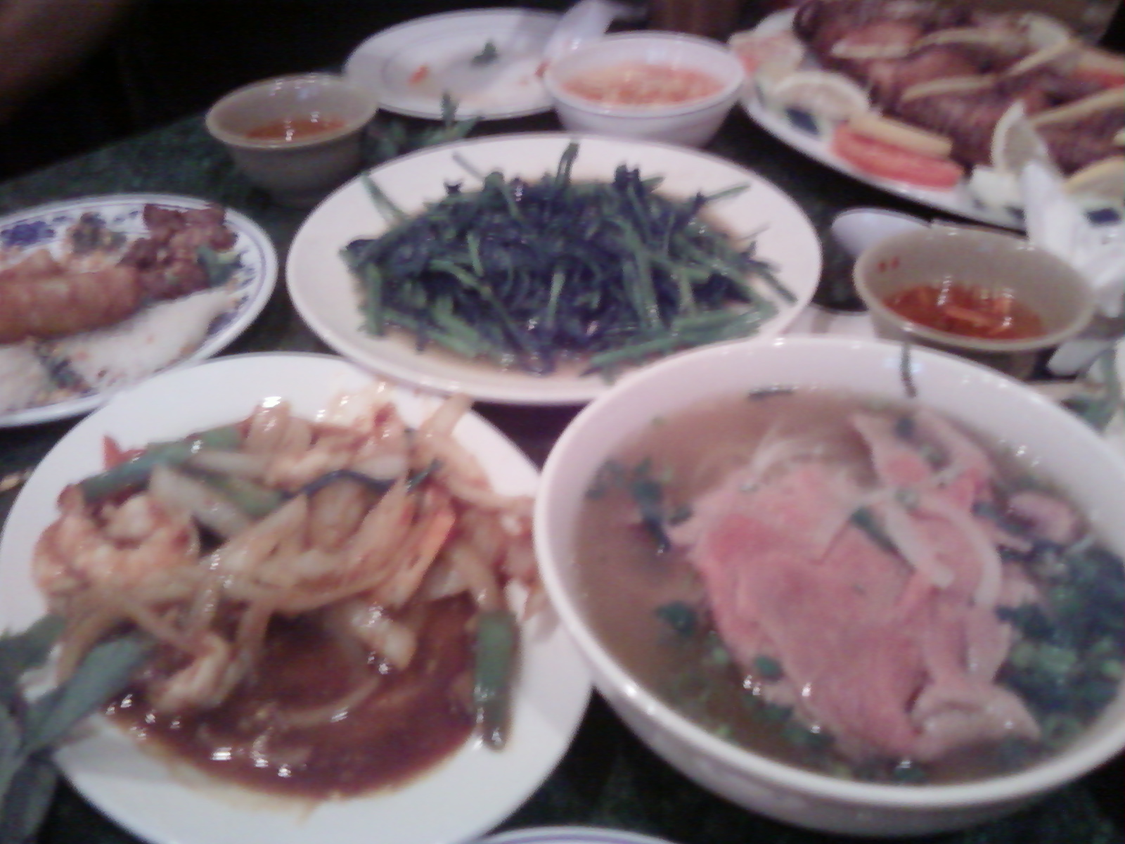 And of course, can’t forget a big bowl of Pho (beef noodle soup). (See bowl of soup in first picture.)