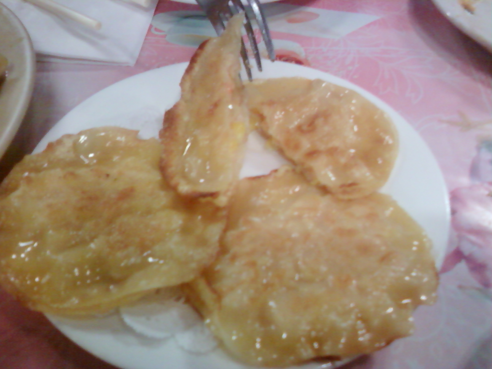 Pan Fried Sweet Corn Cakes (filling inside is shrimp with corn sandwiched between two pot sticker sheets and pan fried)