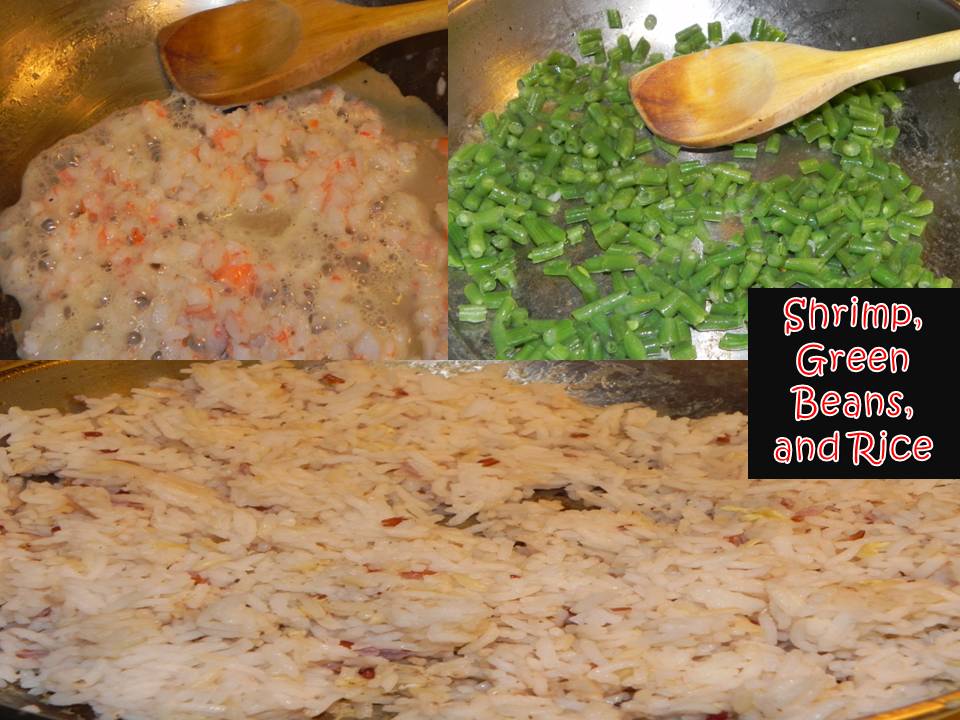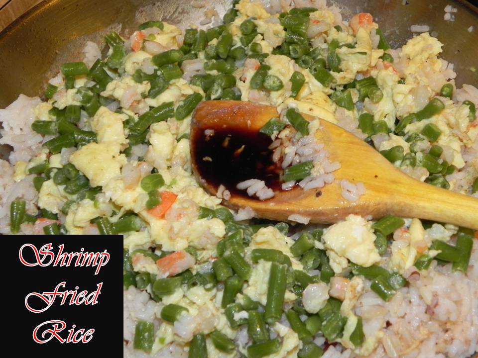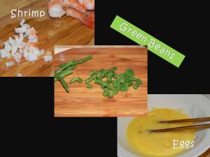 - With the rice in the pan, put in the egg, green beans, and shrimp. Stir and mix. Measure out the soy sauce or salt ahead of time so you don’t end up pouring too much and add in desired amount.