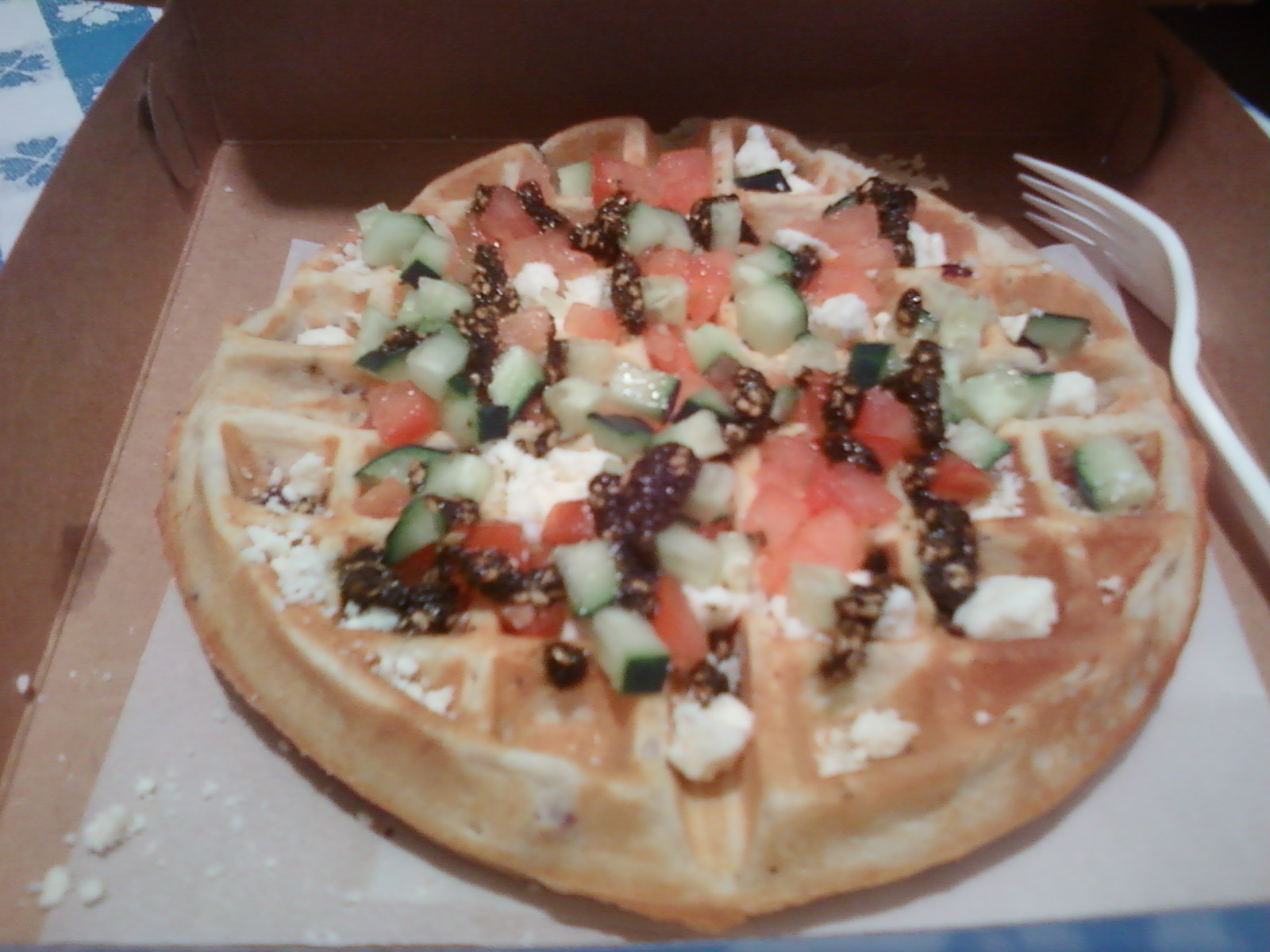 My goodness…you are slow, but I still wuv you because your woofle’s so good. Yum. (I had the Arabian Night which is a vegetarian waffle topped with cucumber, tomatoes, feta, olives, etc, and I have also tried their plain woofle with nutella. omg…so good!)