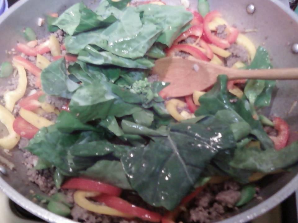 Once the chicken is about cooked, we add in the bell peppers and the kai-lan (or other green leafy veggies). You can add a dash of water and put the lid on to help this cook faster. A few minutes will do it.