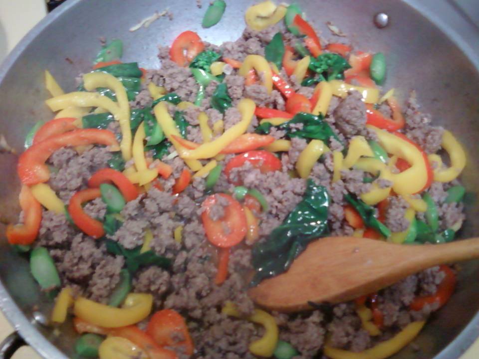 In a pan or Wok, put in some oil (about 1 tsp. will do) and heat it up. Carefully, put the hot chili peppers (optional) and garlic into pan and let it sautéed for a few seconds.