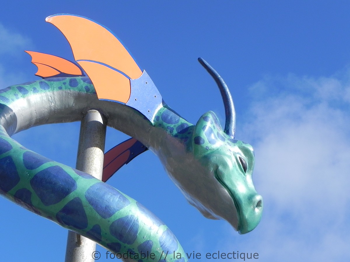 The piece titled, “Sea Dragon” by Deana Mando is located near the other two sculptures we featured last week. The art piece is made of epoxy fiberglass over flexible aluminium tube so that it’s flexible and can coil on to a pole looking out the bay.