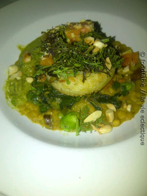 Risotto Cake – saffron chana dahl & baby carrot tajine, braised green garlic, fava beans & spring greens, frisee salad with Medjool dates & Murcott tangerines, green chile harissa, cumin toasted almonds.