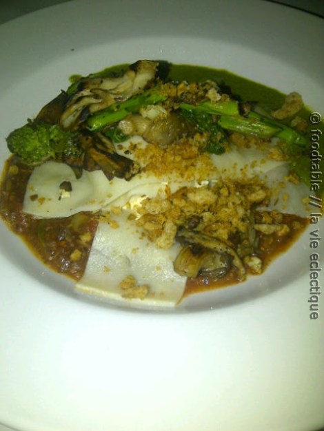 Fazzoletti – Semolina pasta sheet, tofu-sage cheese, cinnamon scented pumpkin seed & fennel sugo, seared rapini with mushrooms, basil pesto, pine nut bread crumbs.
