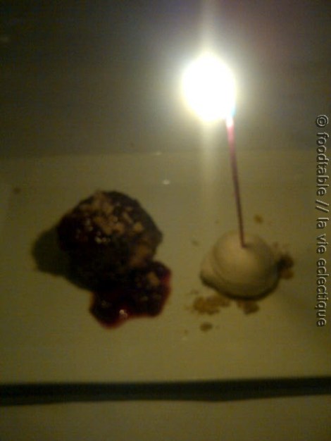And for dessert, we had the Coffee Cake Bread Pudding with walnuts & chocolate chips, cherry-bourbon reduction, vanilla bean ice cream. Of course, if you are strict vegetarian/vegan, you can skip the ice cream. (We are omnivores.)
