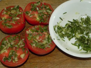- Put tomatoes cut sides up in an oiled small baking dish and drizzle with a third of garlic mixture. Roast until tender, 30 to 40 minutes.