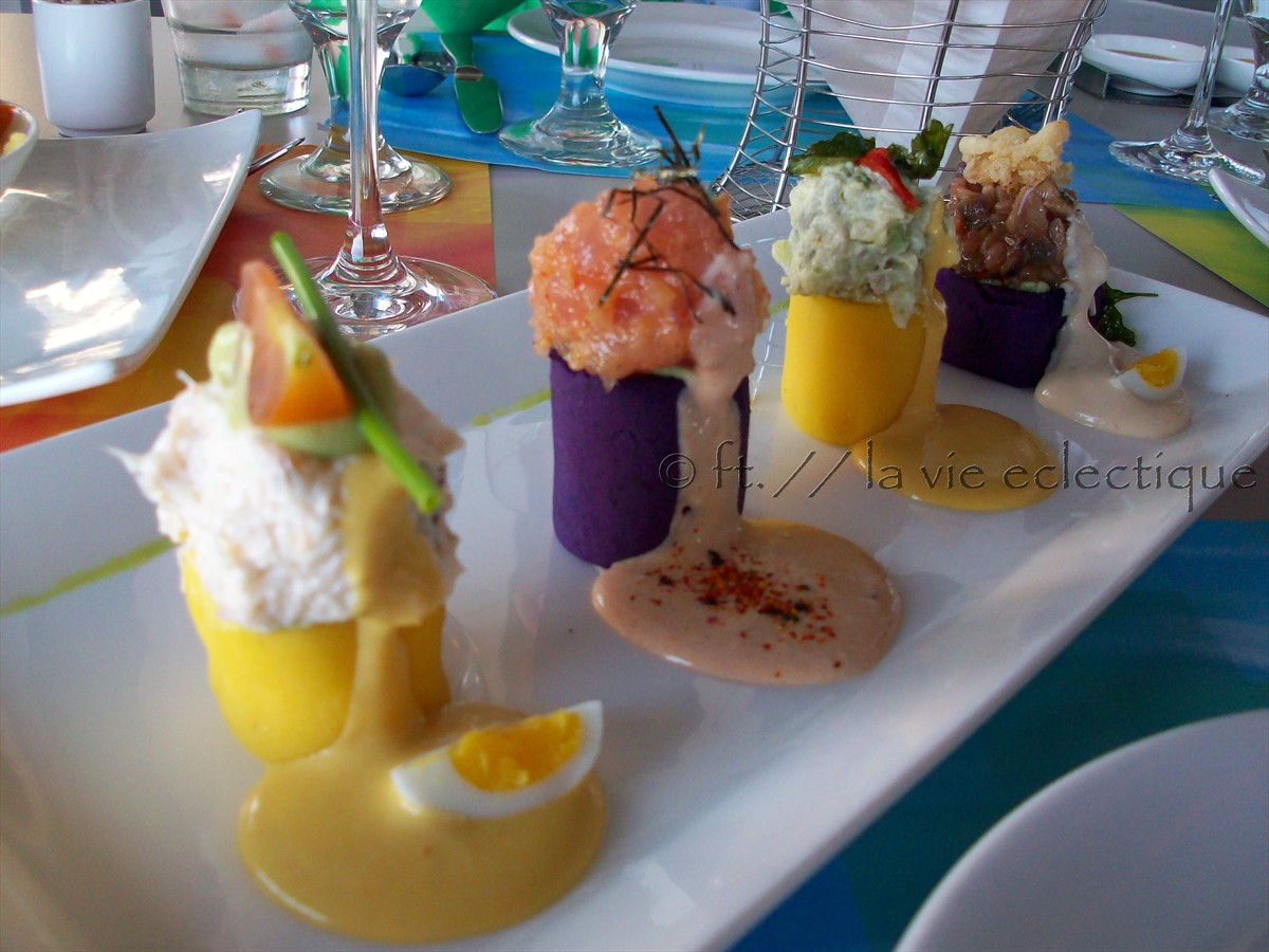 Yes, the yellow and purple things are potatoes craved out and the ceviche put on top. Really creative and pretty.