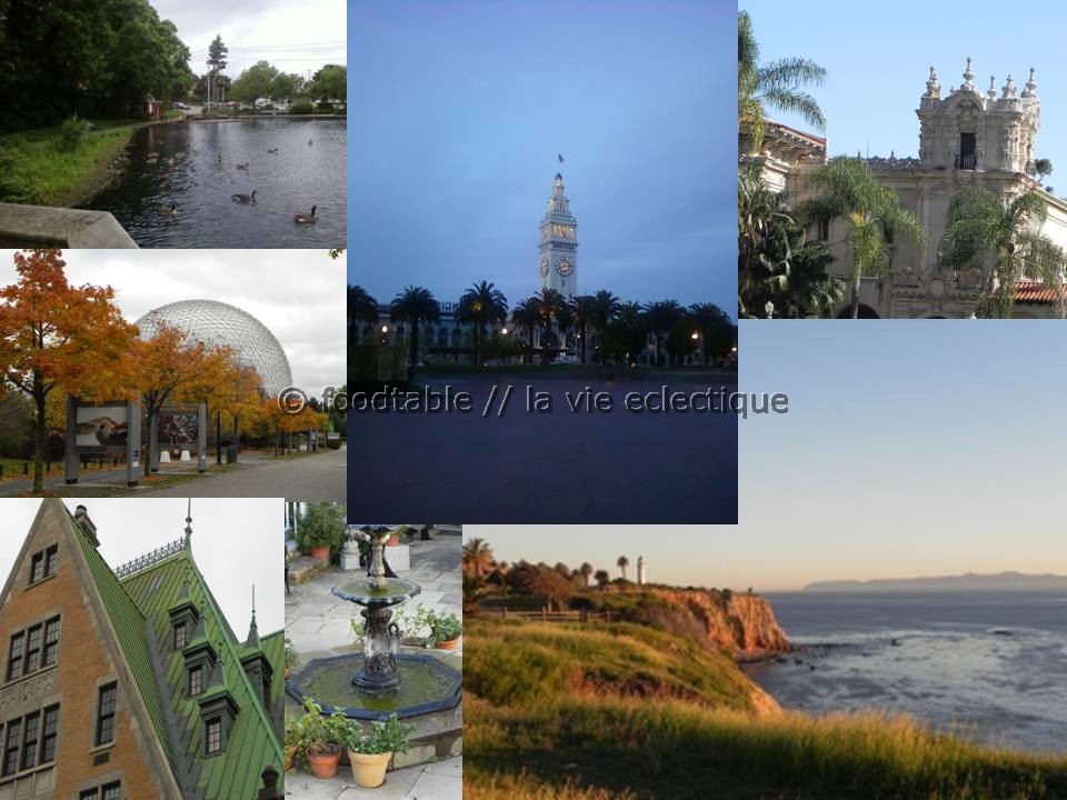 Pictures from some of the places I visited…(L – R): Neighborhood park in Long Island, NY; Ferry Building in San Francisco, CA; Balboa Park in San Diego, CA; Biosphere in Montreal, Canada; train station in Quebec City, Canada; Fountain inside a historic home in the French Quarter, New Orleans, LA; Manhattan Beach Pier in Los Angeles, CA.
